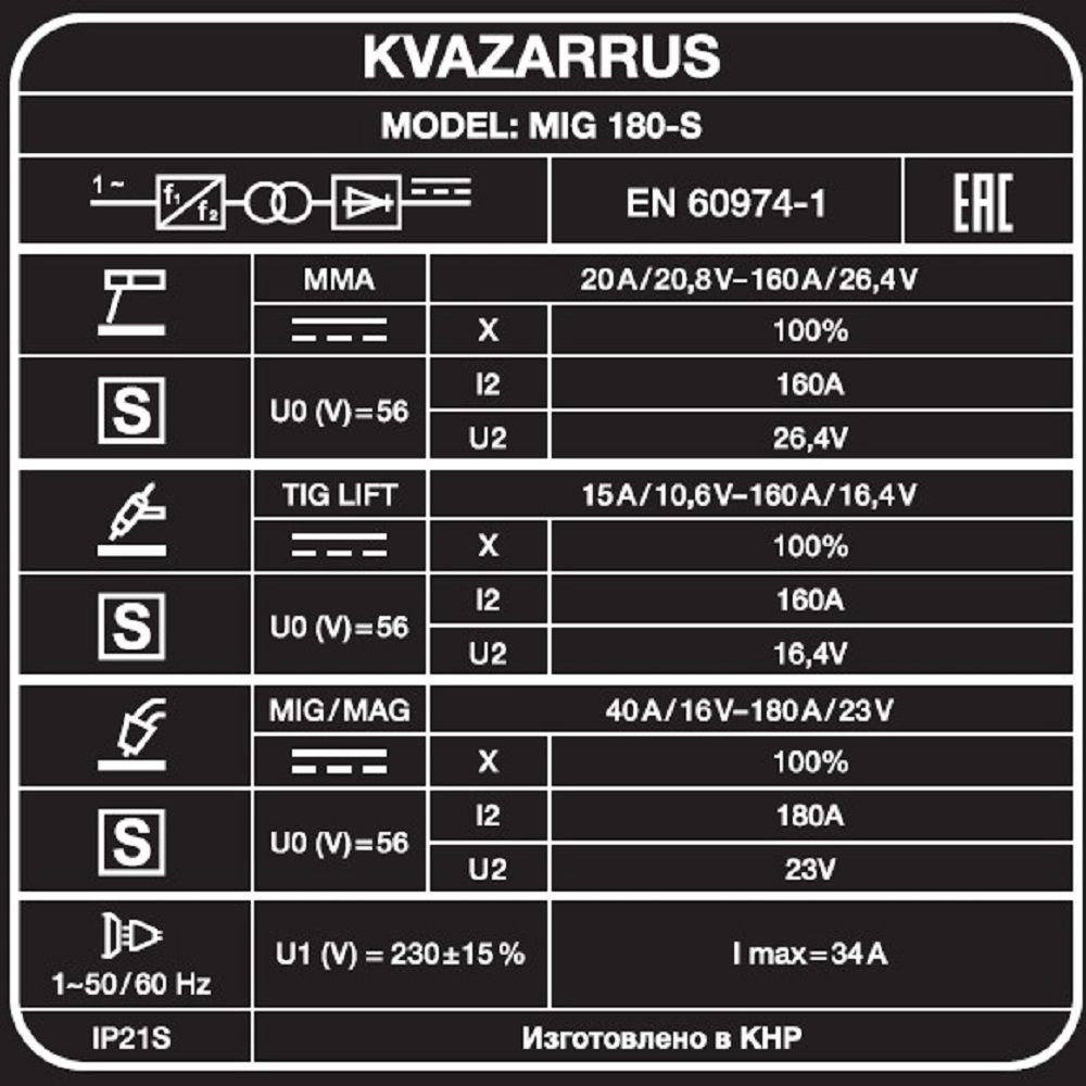 KVAZARRUS MIG 180 - S имеет синергетическую систему управления в режиме полуавтоматической сварки. Синергетическое управление дает возможность модифицировать все сварочные параметры, осуществляя регулировку лишь единственного параметра. Наличие синергетического режима управления позволяет легко и быстро настроить аппарат под любую задачу. В этом случае, имеются следующие преимущества: простота в настройке даже неквалифицированным персоналом, быстрая установка сварочных параметров, гарантированное получение качественного сварного соединения.